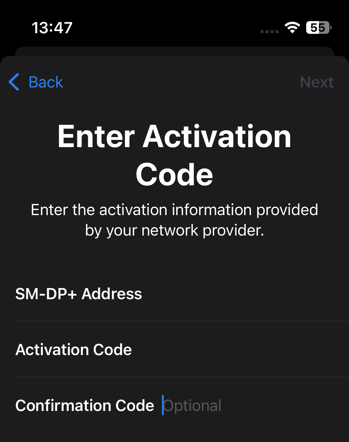 - Copy the SM-DP+ address and activation code from the SIMPal app into the relevant fields.